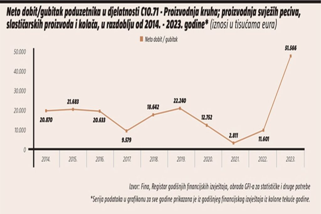 U razdoblju od 2014. do 2023. godine, poduzetnici u razredu djelatnosti NKD 10.71 iskazali su pozitivan financijski rezultat. Najveća neto dobit iskazana je u 2023. godini (51,6 milijuna eura), dok je najmanja bila u 2021. godini (2,8 milijuna eura). Najviše poduzetnika, čija je pretežita djelatnost proizvodnja kruha; proizvodnja svježih peciva, slastičarskih proizvoda i kolača, u 2023. godini imalo je sjedište u županiji Grad Zagreb (209), a po njihovoj brojnosti slijedi Splitsko-dalmatinska (109) i Zagrebačka županija (89), dok je najmanje poduzetnika u promatranoj djelatnosti bilo u Požeško-slavonskoj županiji (8). Najveće ukupne prihode ostvarili su poduzetnici u županiji Grad Zagreb u iznosu od 316,5 milijuna eura, kao i najveću neto dobit (12,9 milijuna eura).