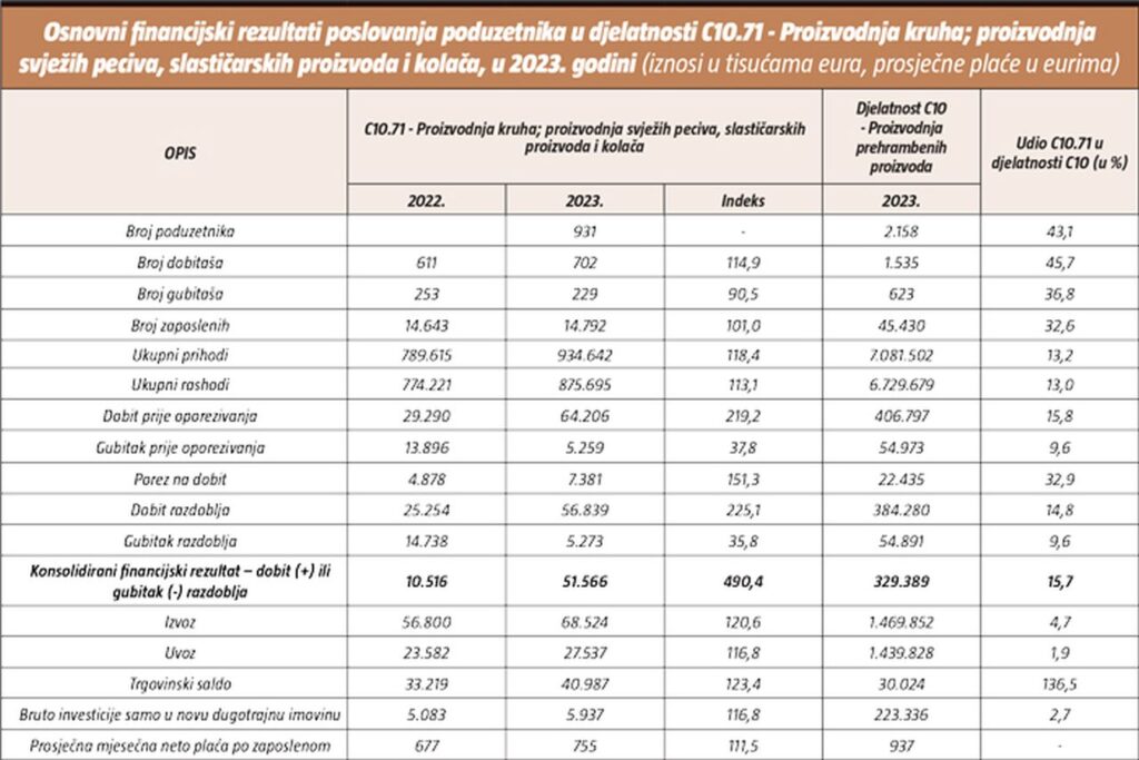 Prema podacima iz obrađenih godišnjih financijskih izvještaja za statističke i druge potrebe, u djelatnosti proizvodnje kruha; proizvodnje svježih peciva, slastičarskih proizvoda i kolača (NKD 10.71), u 2023. godini poslovao je 931 poduzetnik s 14.792 zaposlena, što je za 1,0% više zaposlenih u odnosu na 2022. godinu. Navedena skupina poduzetnika u promatranom je razdoblju ostvarila ukupne prihode u iznosu od 934,6 milijuna eura, što je 18,4% više u odnosu na prethodnu godinu, te ukupne rashode od 875,7 milijuna eura, što je više za 13,1%.