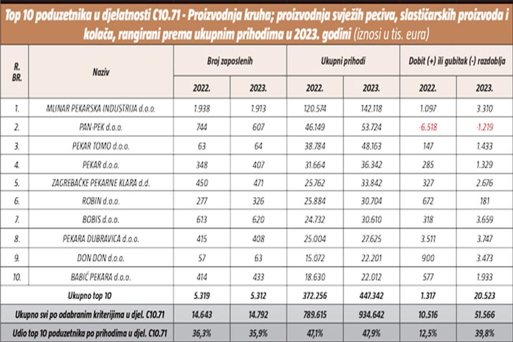 Deset poduzetnika u djelatnosti proizvodnje kruha; proizvodnje svježih peciva, slastičarskih proizvoda i kolača s najvećim prihodima u 2023. godini zapošljavali su 35,9% radnika promatrane djelatnosti, ostvarili 47,9% ukupnih prihoda i 39,8% neto dobiti.